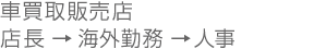 大澤さんは、クルマ買取販売店で店長をしていましたが、ずっと海外で仕事をすることが夢で、一度は会社を辞めてアメリカに留学した後、また元の会社に戻りました。入社通算10年後に念願がかなって、タイで働くことになりました。現在はタイから戻って人事の仕事をしています。