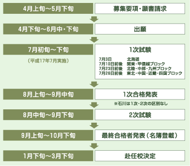 各都道府県市の教育委員会から募集要項を入手することから始まって、志願書の提出、受験、採用内定、赴任先の決定、とおおむね4月から翌年の3月ごろまでかかるロングラン。
